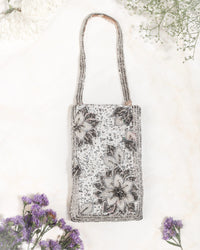This intricate Rectangular Design Mobile Pouch with Applique leaf work arranged in corners , with sequins, and Kathdana and Bead work in a stunning Silver Colour! This is perfect to keep any important IDs, money and your mobile!