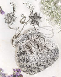 Intricate Applique Green Leaf Work in the Corners is what makes this Potli a dream come true! Designed with Sequins and Kathdana Bead Work, and tassels of beads and crystals that shimmy when you walk, or dance! Sweet and Simple in Pristine Silver, This Silver Potli is all you need for your next Festive Event!