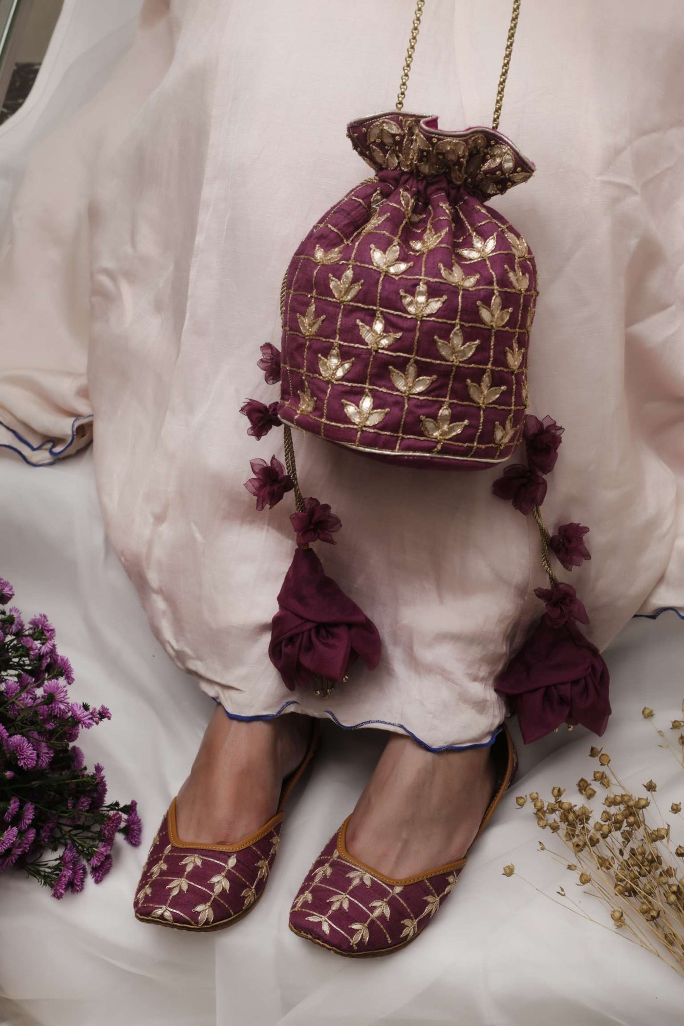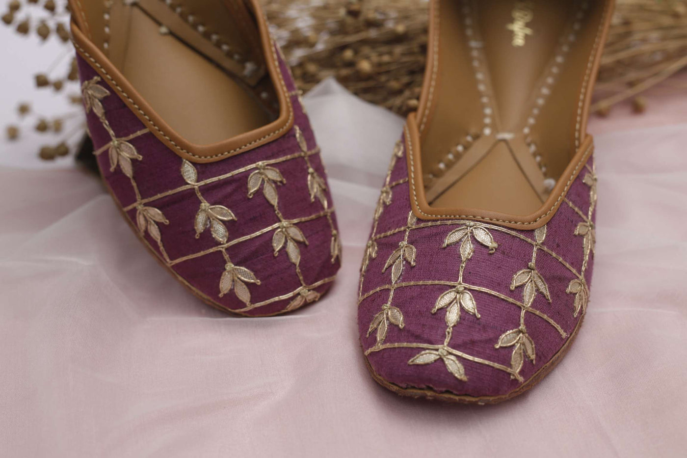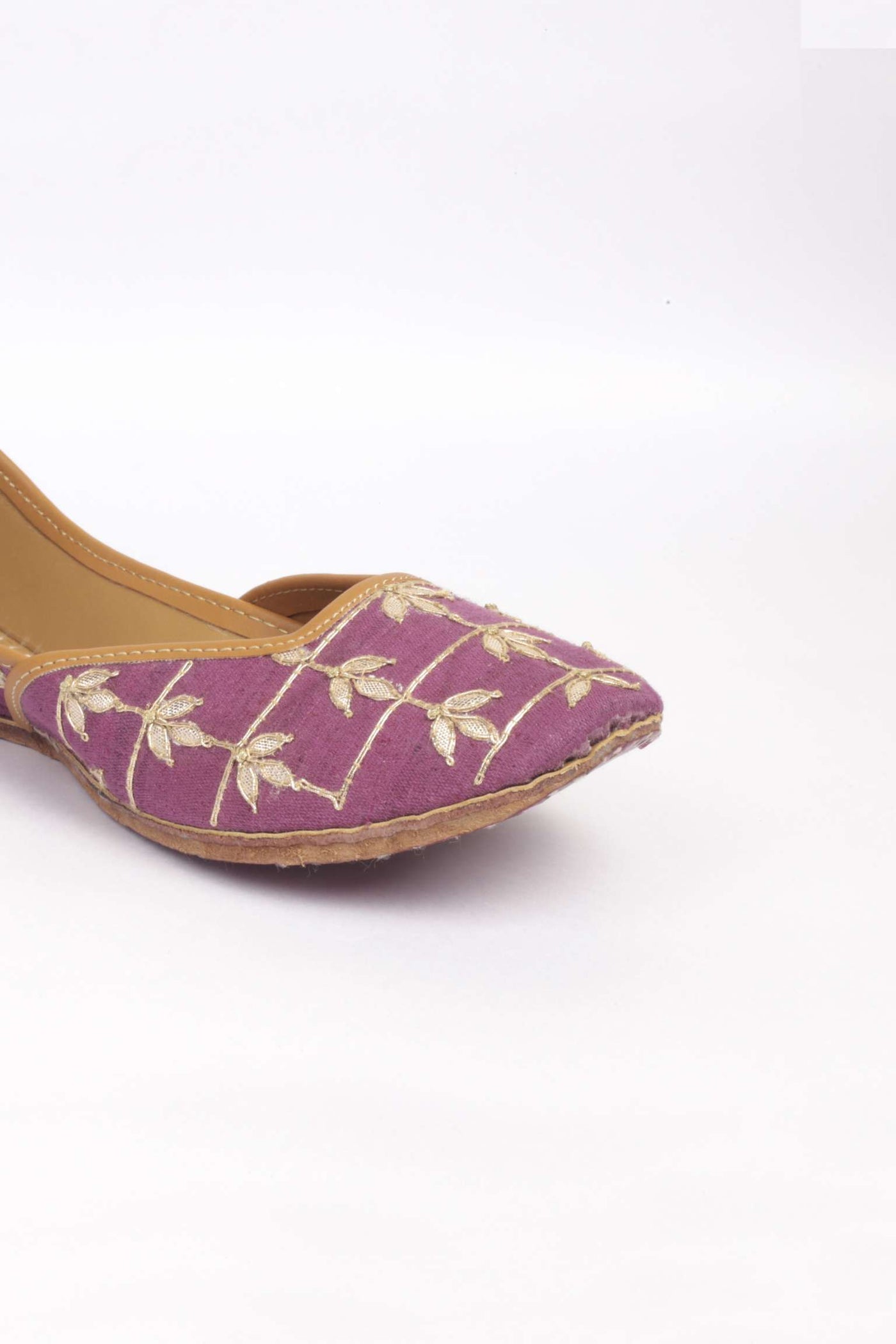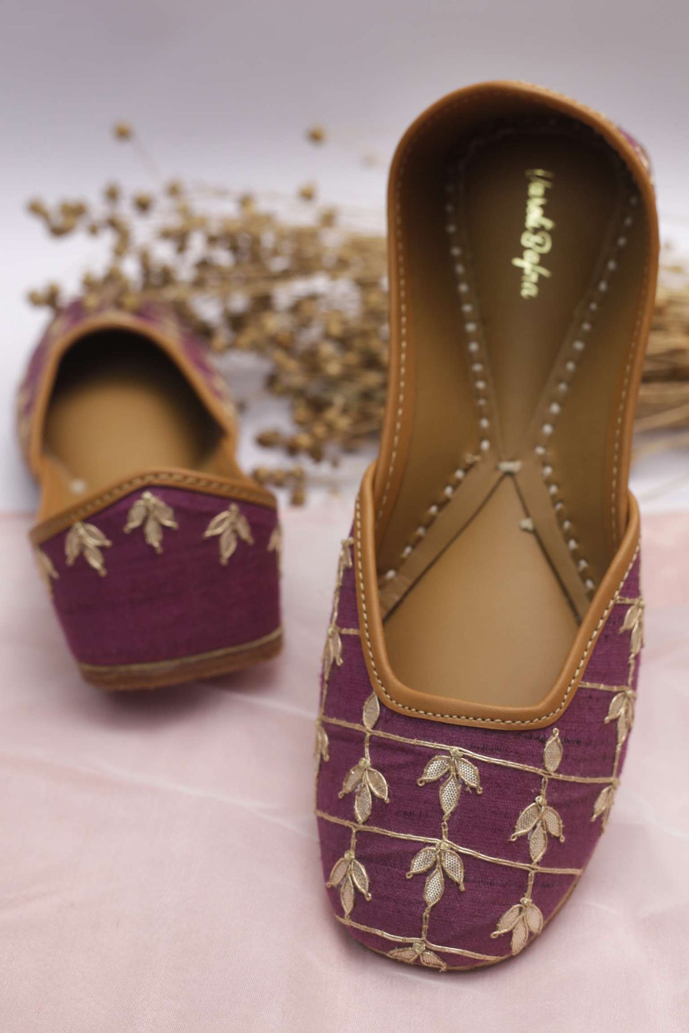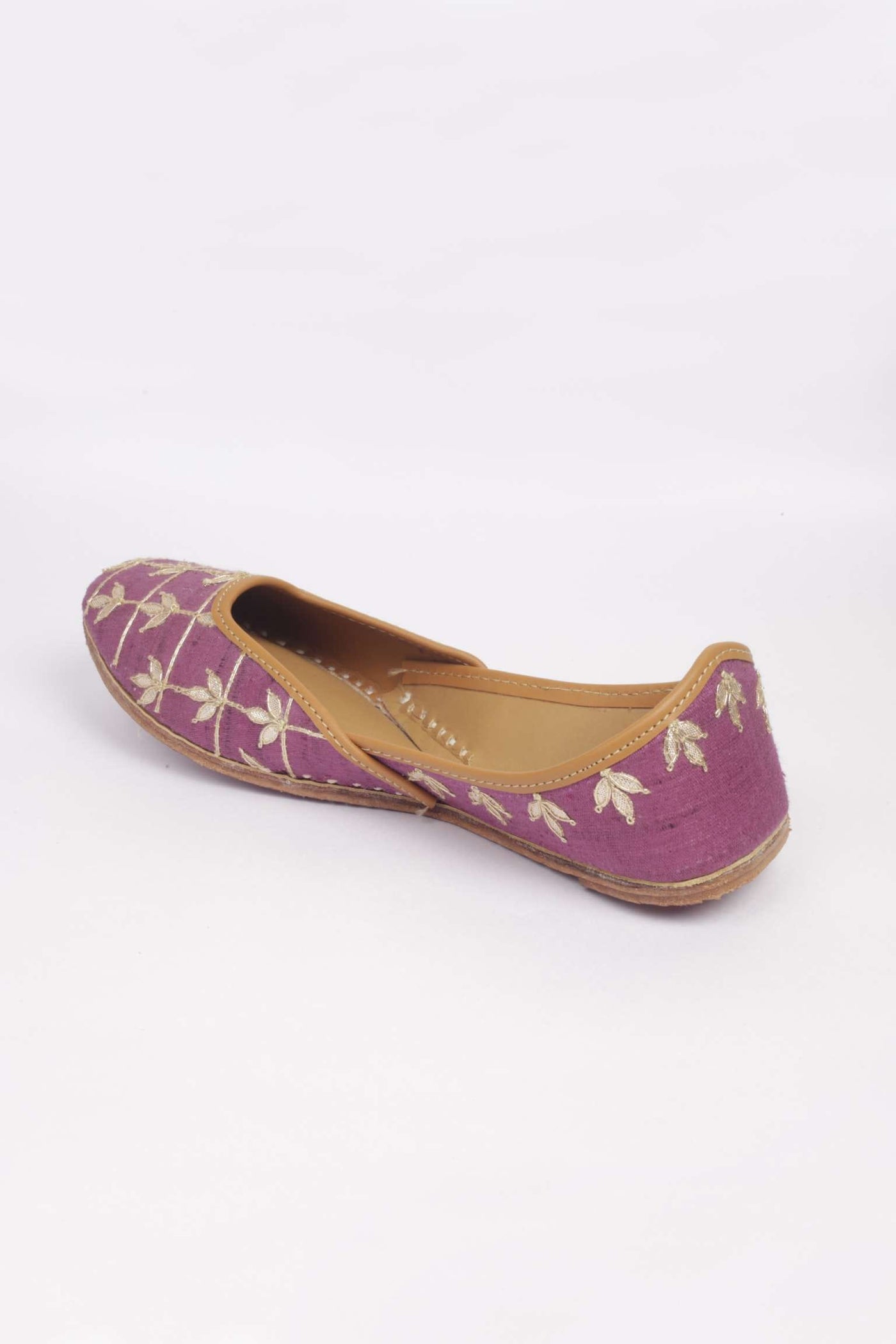 Organic in its origin and feel, this product is style, substance and charisma, all rolled into one. Designed in a leaf shape, the eye-catching dori work on the border makes Gehna Jamunia worth the investment. A match made in heaven, all sides of the shoe- front, back and the inner are marvels in their own right. Both, the gota and the buta work dominate the neckline woven meticulously into vegetable tanned leather. The presence of double cushioning makes it a jutti that your feet deserve. These are juttis with a soul and no discomfort whatsoever will be felt, rest assured!