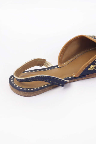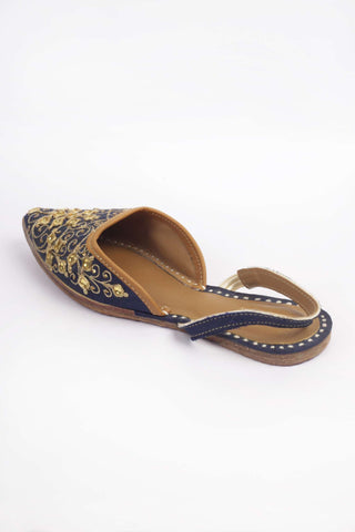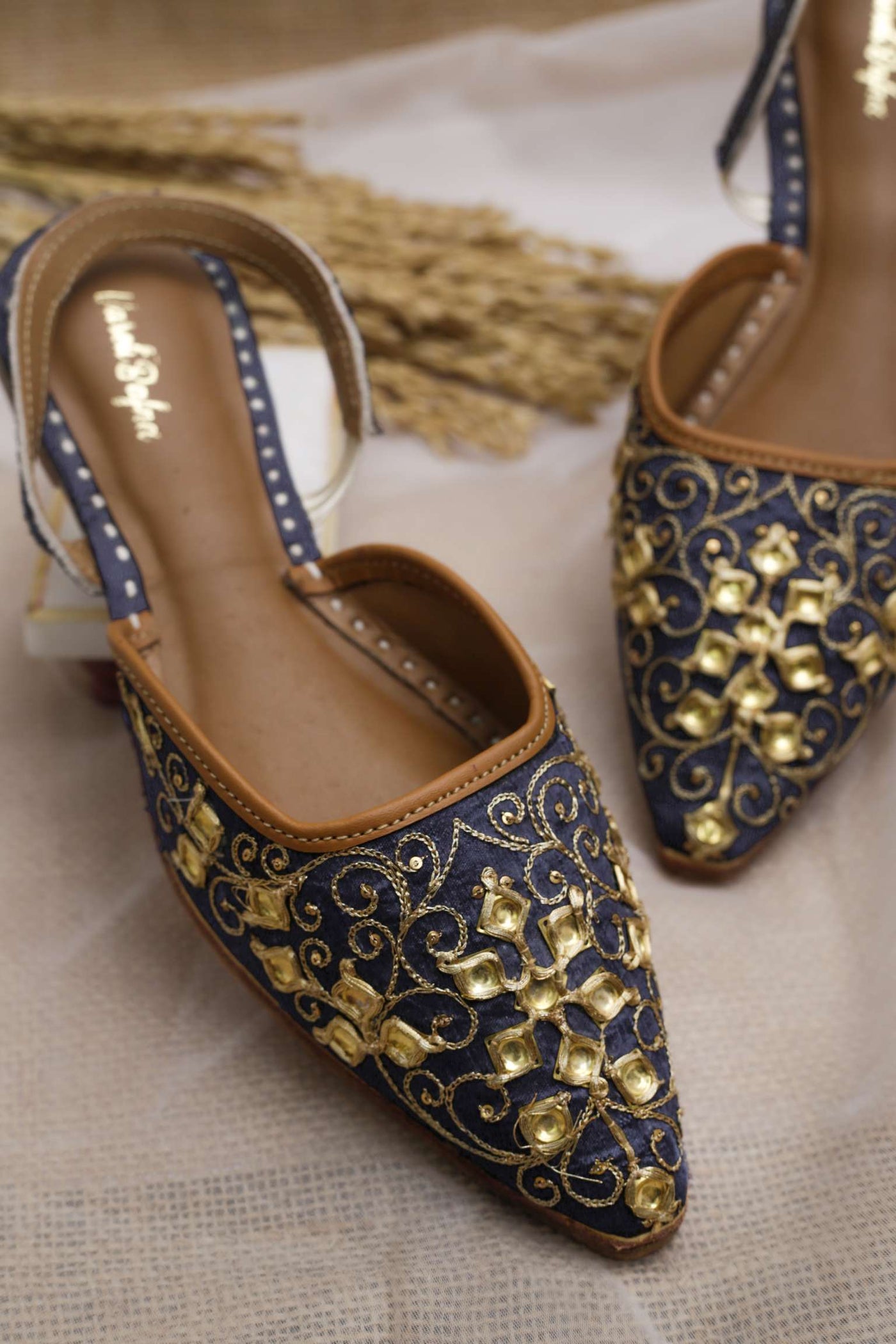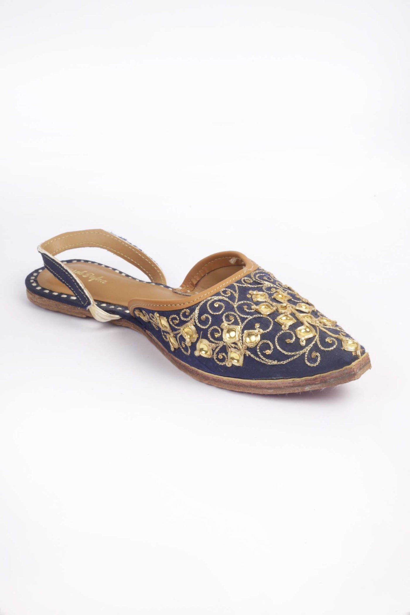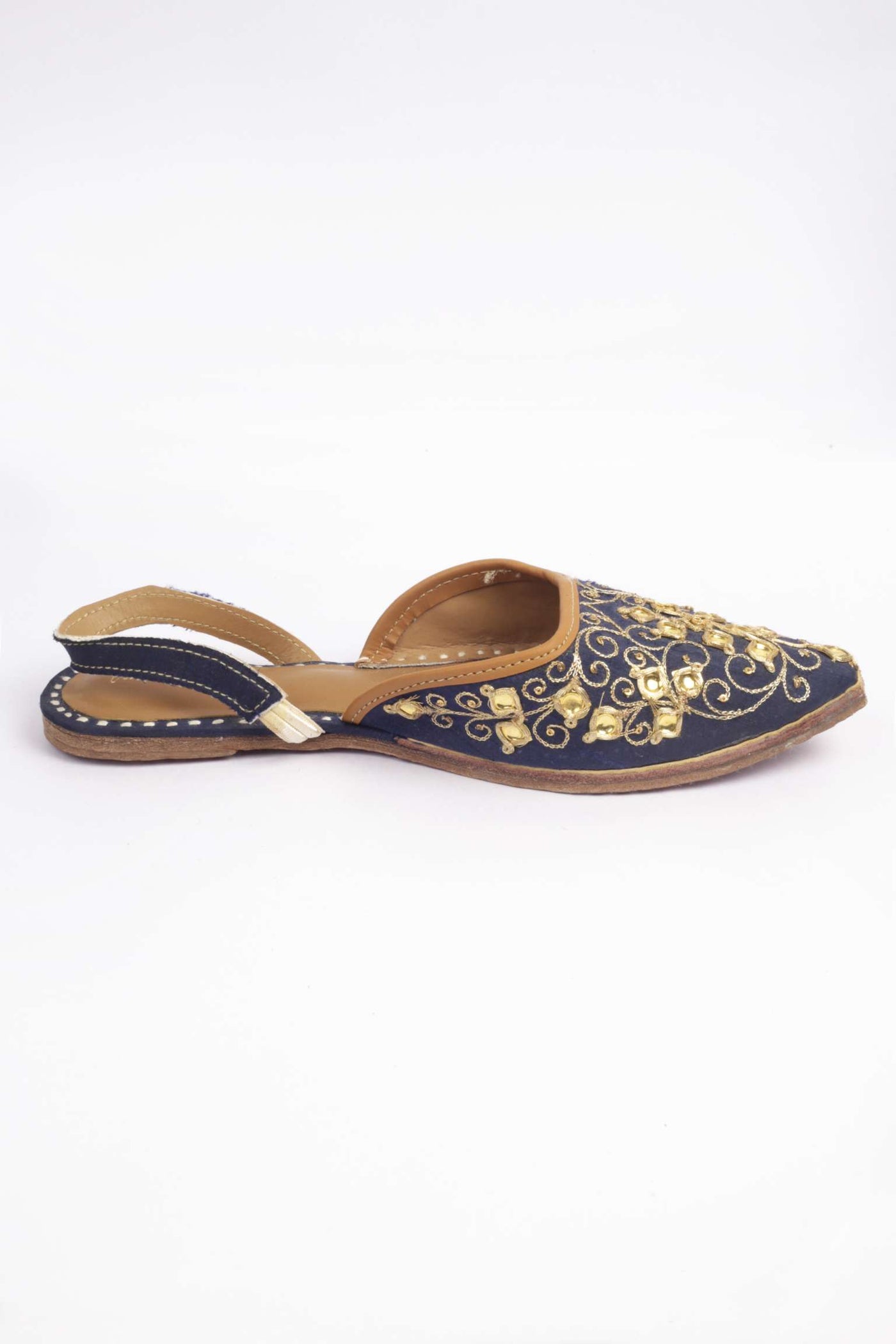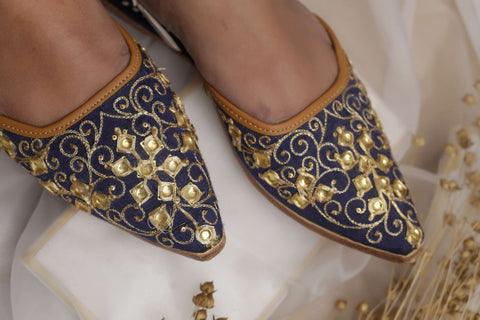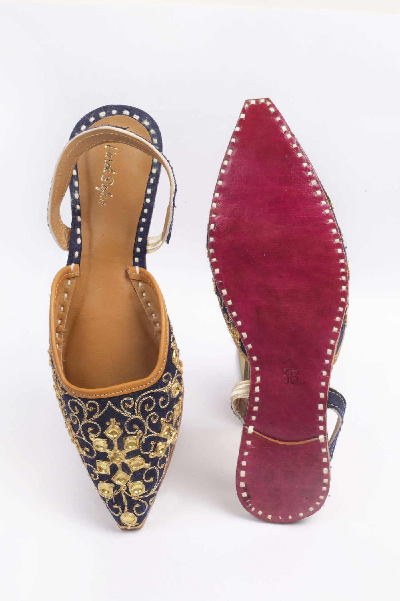 Looking for ethnic jutties? Check out these tasteful pair of Indian karigiri jutties in imperial blue. Dipped in gold Rajasthani danka work and zari embroidery, the Gehna Neelam are for those who like to flaunt themselves in majestic grandeur and why not? The golden zardozi composition creates a stunning embellished look on the imperial blue. The ankle belt is also laden with thin zari embroidery. The covering is made of vegetable tanned leather with double cushioning to keep your feet comfortable when you decide to groove. Pair these jutties with bright coloured lehengas or shararas to bring the party alive.